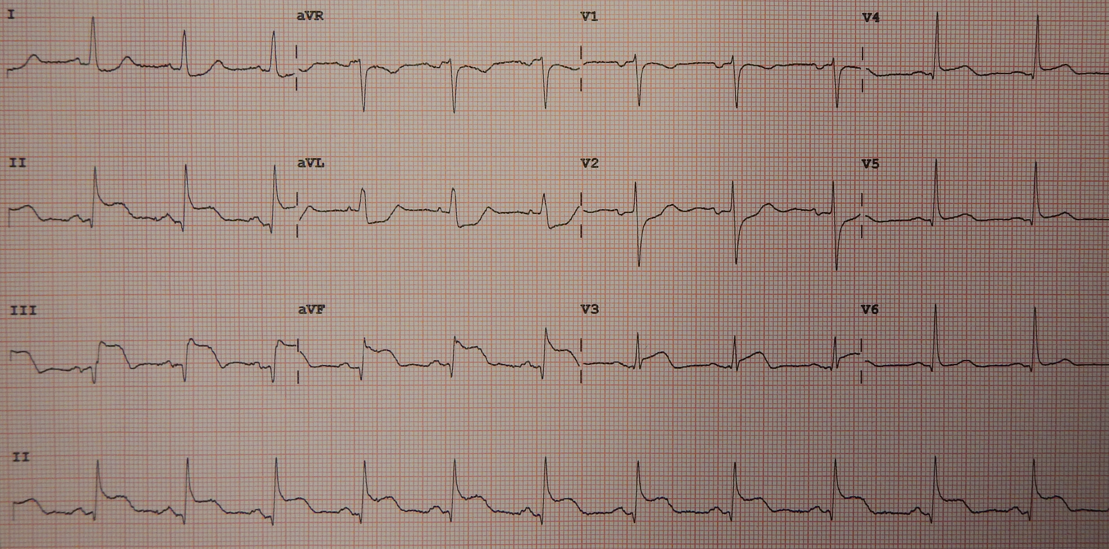 위 ECG를 보면 II, II, aVF에 ST elevation이, aVL에 reciprocal한 ST depression이 확인된다.
