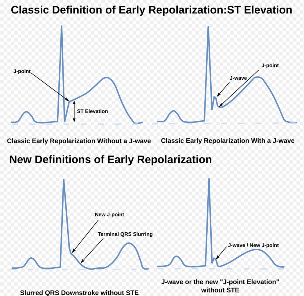 12-lead ECG에서 ST elevation을 확인하게 된다면 STEMI를 의심해야하므로 주의깊게 심전도를 보아야 합니다. STEMI mimics란 심전도에서 ST elevation이 있지만, 실제 STEMI는 아닌 것으로 대표적으로 Early repolarization, Pericarditis, LBBB, LVH, Brugada syndrome 이 있습니다. 오늘은 순서대로 STEMI mimics에 대해 위의 대표적인 5가지 경우에 대해 알아보도록 하겠습니다. 1. Early repolarization Early repolarization은 흉통을 호소하는 환자 ECG 중 약 1%에서 확인되며 J point elevation, ST elevation with end-QRS notch 또는 end-Q..